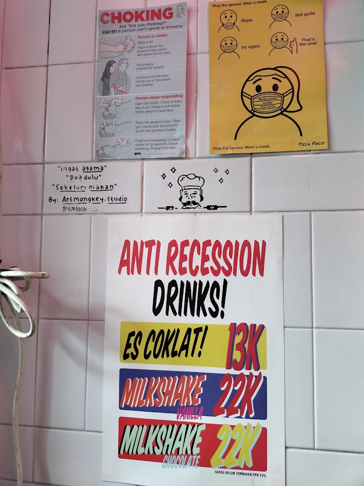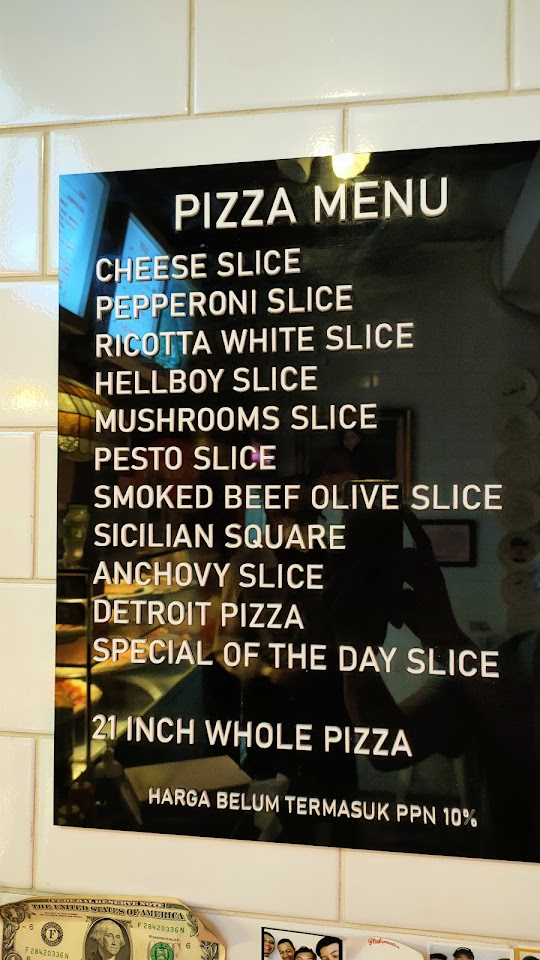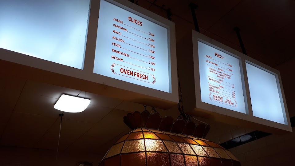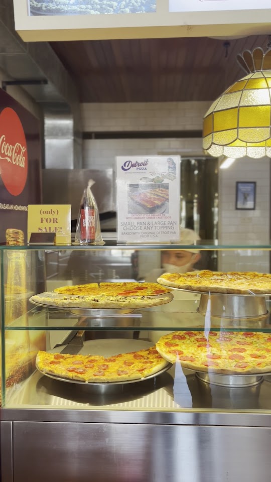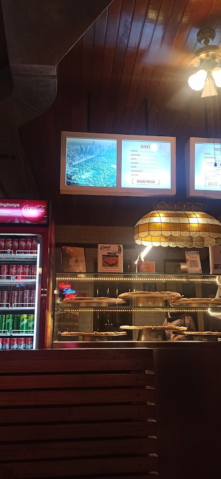 Restoran simpel pesan di konter yang menawarkan pizza tradisional dengan topping daging dan sayuran.